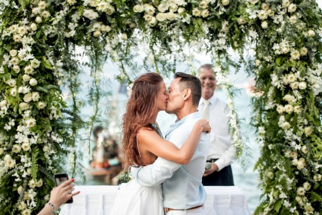 The Western ceremony was fun, impulsive and joyful. After the Phuket wedding celebrant announced them as man and wife they kissed, high fived each other and then Vinny threw his beautiful bride over his shoulder and headed down the aisle.